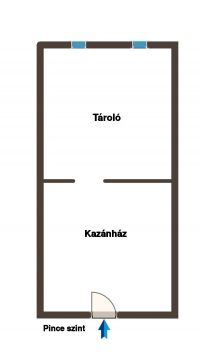A ház hátsó homlokzatához egy kisebb tároló csatlakozik, amely a lakótérből nem, kizárólag a kert felől érhető el. A pince a tárolóhelyiségen keresztül közelíthető meg, ahol egy további tároló, valamint a kazánház kapott helyet.